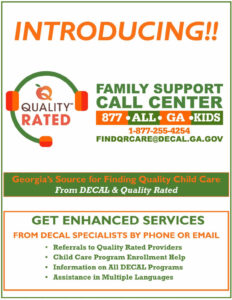 The QR Family Support Call Center Referral Specialists still deliver the services families have always received through 877-ALL-GA-KIDS (1-877-255-4254), including information on the benefits of high-quality child care, referrals to Quality Rated providers matching their preferences, and help with the enrollment process at the programs they choose. Additionally, the Referral Specialists can personally connect callers to agency colleagues who will help them access other free and beneficial DECAL family services and resources. These enhanced services are available to callers in English, Spanish, and other languages.